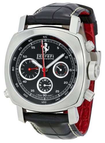 Stainless steel case with a black alligator leather bracelet. Fixed stainless steel bezel. Black dial with luminous hands and Arabic numeral minute markers (at 5 minute intervals). The Ferrari Prancing Horse logo apperas at the 12 o'clock position. Tachymeter scale around the outer rim. Chronograph - three sub-dials displaying: 60 seconds, minutes and 12 hours. Self winding chronometer movement. Scratch resistant anti-reflective sapphire crystal. Fluted stainless steel crown. Sapphire crystal case back. Case diameter: 45 mm. Case thickness: 17 mm. Tang clasp. Water resistant at 100 meters/ 330 feet. Panerai Mens Ferrari Granturismo Rattrapante Watch Model FER00005.